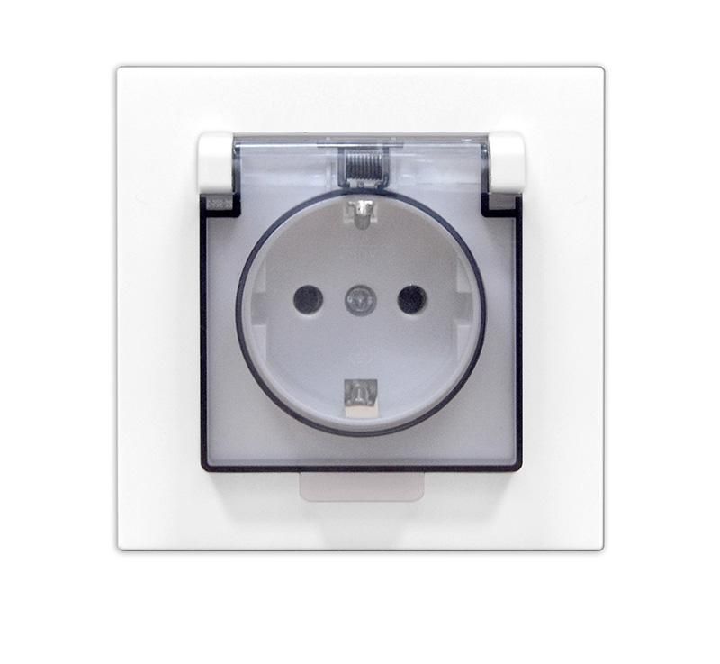 Розетка одноместная с прозрачной крышкой, с заземлением, санитарно-установочная, 16А, 220В, белая, универсальная, еврослот, механизм в сборе от бренда Universal (артикул a0030) из серии «Афина» предназначена для надёжного подключения бытовых приборов в помещениях с повышенными требованиями к гигиене - медицинских учреждениях, детских садах, школах, кухнях и ванных комнатах.