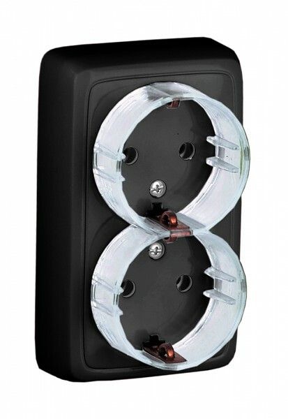 Розетка открытой установки, двухместная, с заземляющим контактом, со шторками, изолирующей пластиной, цвет черный | РА16-184-08 HEGEL