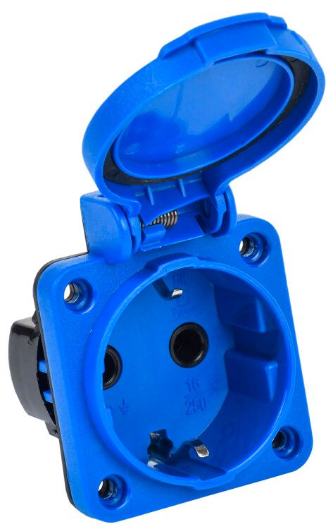 - Цвет корпуса: синий - визуально отличает розетку от бытовых моделей, повышает узнаваемость в сложных системах