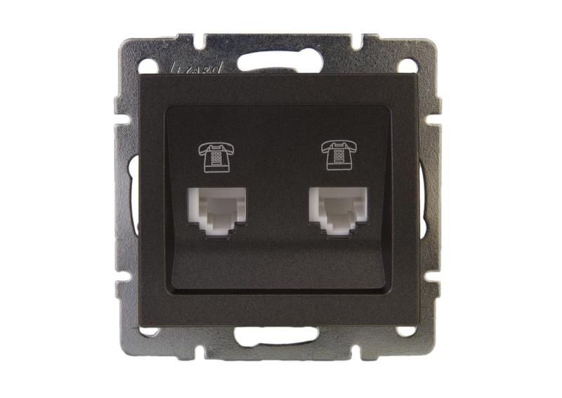 Розетка телефонная двойная RJ11 Euro стандарт с механизмом в цвете черный графит матовый от бренда Lezard, артикул 703-4188-138 - предназначена для подключения двух телефонных устройств через интерфейс RJ11 в скрытых электромонтажных коробках. Продукт из серии RAIN сочетает надежную механическую конструкцию и современный дизайн, подходящий для жилых и офисных помещений.