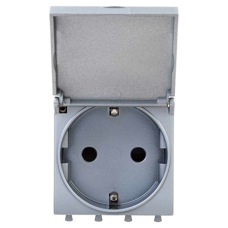Розетка с крышкой модульная, 2P+E, с защитными шторками, закаленная сталь, 2 модуля от DKC (ДКС), артикул 4404012 - это скрытно устанавливаемое устройство для безопасного подключения бытовых и профессиональных электроприборов в системах организации рабочих мест. Устройство совмещает защиту от доступа детей, антибактериальную обработку и стильный матовый серый дизайн, подходящий для современных интерьеров.