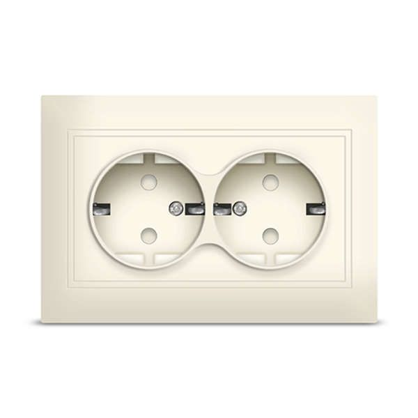 Розетка 2-местная с заземлением и защитными шторками слоновой кости (ivory) от бренда Universal, артикул б-с0050, серия Севиль - надёжное решение для внутренней проводки в жилых и офисных помещениях. Подходит для подключения бытовой техники, зарядных устройств и других приборов с трёхконтактной вилкой.