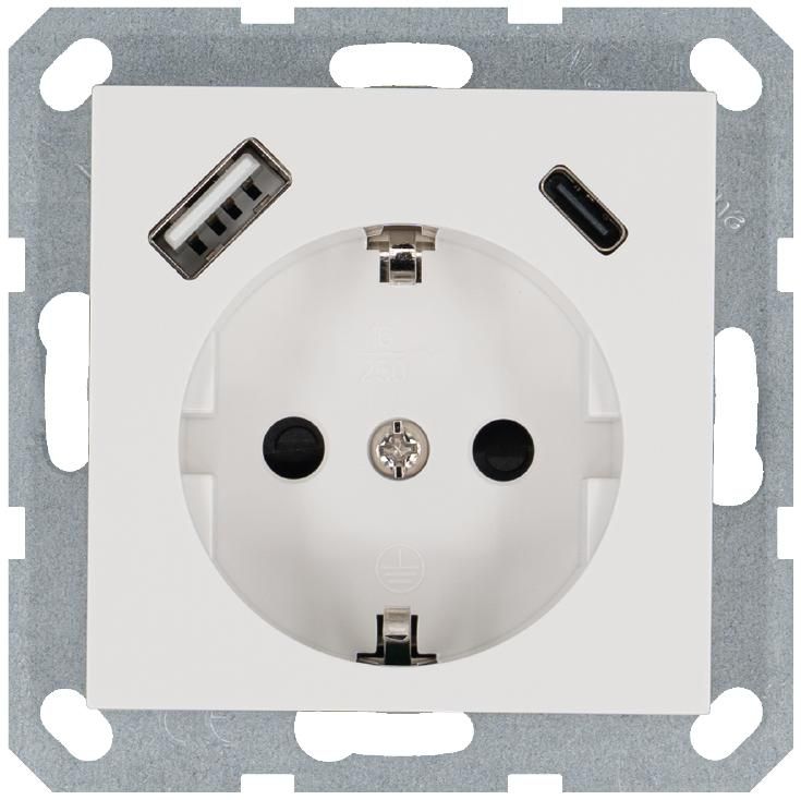 Розетка Shuko 16А с заземл. защ. шторки 2-мя заряд. устройствами USB тип A+C 25Вт механизм бел. глянцевый Jasmart G5501USB-25W
