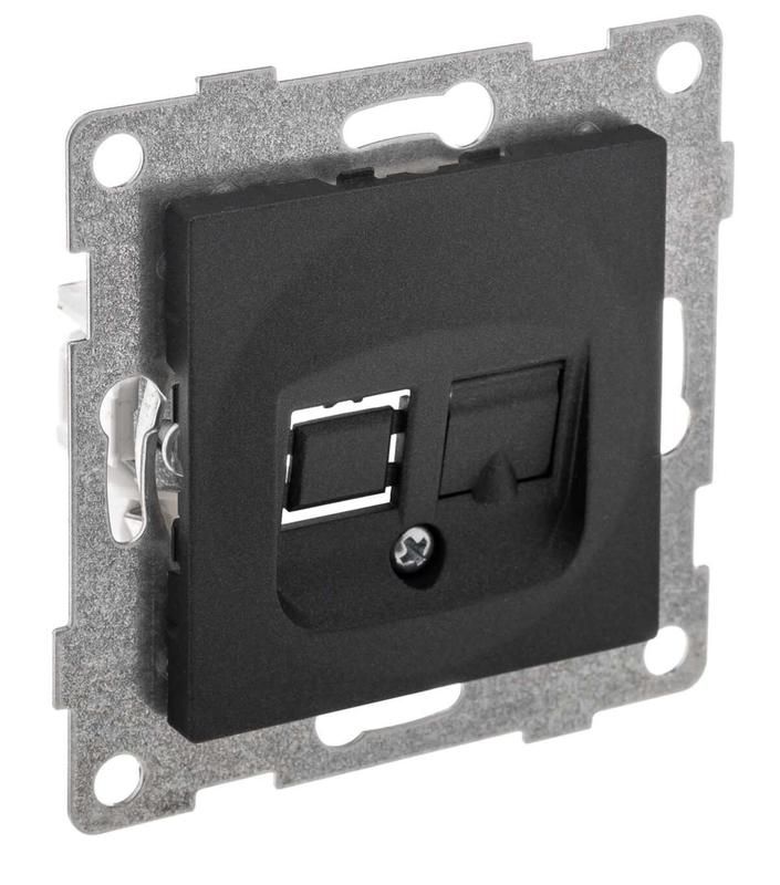 Розетка телефонная одинарная с механизмом, цвет графит, тип цоколя RJ12, серия GUSI - устройство для подключения телефонной аппаратуры и других низковольтных систем через разъём RJ12. Монтируется в стену, совместима с рамочной системой GUSI, артикул с10т1-010.