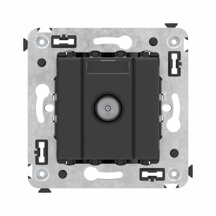 Розетка телевизионная оконечная в стену, черный матовый устанавливается в стандартную подрозетник глубиной не менее 40 мм. Крепление - винтовое, с помощью двух болтов на механизме. Для монтажа необходим коаксиальный кабель с F-разъемом. Накладка легко снимается для доступа к контактам. Совместима со всеми типами кабелей для ТВ-сигнала, включая RG-6, RG-59, S-50, S-75. Не требует питания. Работает в паре с другими розетками серии Avanti от DKC.