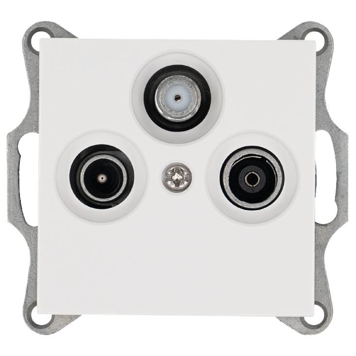 Эта розетка объединяет три типа сигнала в одном корпусе: телевизионный (TV), FM-радио и спутниковый (SAT). Подходит для установки в квартирах, домах, гостиницах, офисах - там, где требуется одновременное подключение телевизора, радиоприёмника и спутникового ресивера. Благодаря проходному принципу, один входной кабель может питать сразу несколько розеток в цепочке, что удобно при сквозном монтаже в стенах или панелях.