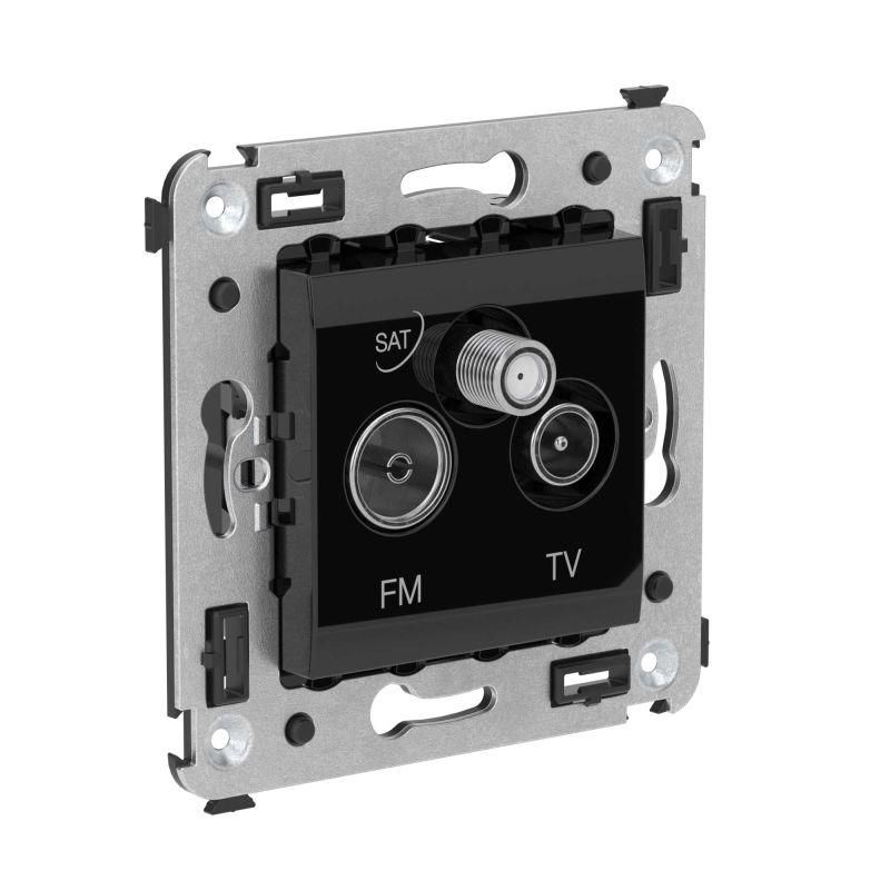 Розетка TV/FM/SAT в стену «Черный квадрат» позволяет подключить три типа сигналов: телевизионный (TV), FM-радио и спутниковый (SAT) через один корпус. Удобна для установки в гостиной, спальне, домашнем кинотеатре, офисе или зоне отдыха, где нужен минимум отверстий в стене, но максимум функциональности. Применяется в системах предварительно подготовленной проводки - например, при монтаже кабель-каналов, лючков или колонн.