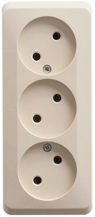 Розетка тройная открытой установки без заземления без защитных шторок 16А 250В кремовая от Systeme Electric (артикул pa16-009k) - простое решение для подключения нескольких бытовых устройств в помещениях без требований к заземлению. Подходит для внутренней установки на поверхность стен, особенно там, где проводка выполнена открытым способом.