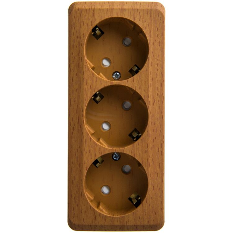 Розетка Systeme Electric этюд pa16-012t - тройная розетка открытой установки с заземлением и защитными шторками, рассчитанная на работу в бытовых и промышленных сетях до 250 В и 16 А. Цвет «бук» имитирует натуральное дерево, что делает её подходящей для интерьеров с эко-стилем. Произведено в России.