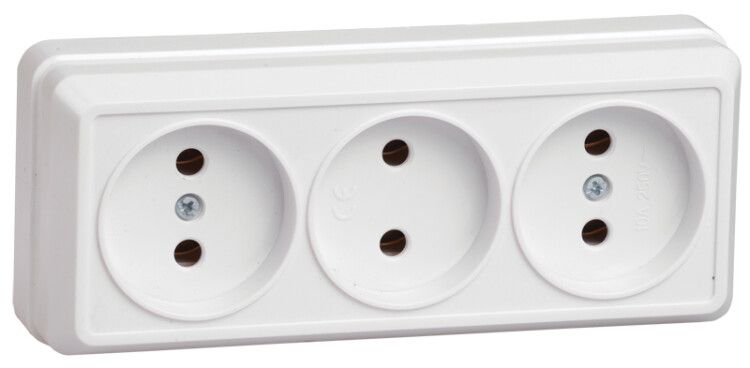 Розетка 3-местная без заземления 10А открытая установка белая предназначена для подключения однопостовых электроприборов мощностью до 2,5 кВт (при 250 В и 10 А): светильники, зарядные устройства, маломощные электроинструменты, телевизоры, компьютеры. Подходит для помещений с невысокими требованиями к безопасности - жилые комнаты, офисы, кладовые, гаражи. Не используется для оборудования с металлическим корпусом, требующего заземления - стиральных машин, холодильников, бойлеров.