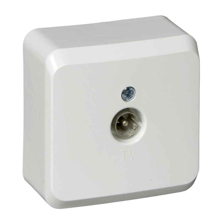 Розетка телевизионная TV 0,7 дБ наружная белая единственная от Systeme Electric (серии Эту́д, артикул tva-002b) предназначена для подключения антенного кабеля в условиях открытой установки - например, на фасадах зданий, в павильонах или там, где невозможна внутренняя проводка.