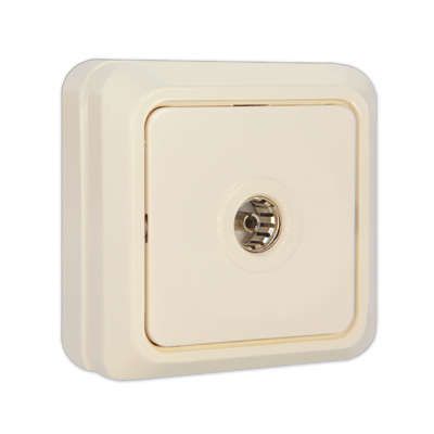 Розетка телевизионная TV наружная однопозиционная открытого монтажа бежевая от бренда Universal (артикул б-о0027, серия Олимп) предназначена для подключения антенного кабеля к телевизору, приставке или модему в условиях улицы или неотапливаемых помещений. Устройство обеспечивает надёжный контакт при открытой установке и защищено от попадания крупной пыли.