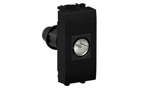 Розетка телевизионная одиночная модульная 1 модуль черный матовый совместима с любыми модульными коробками стандарта DKC Avanti. Крепится винтовым способом - фиксируется на штырях каркаса 4400802 с помощью двух саморезов. Для монтажа в стену необходимо предварительно смонтировать металлический или пластиковый подрозетник. Соединение с кабелем осуществляется через зажимной контакт - достаточно зачистить 10–12 мм оплетки и вставить центральный провод до упора. Накладка легко снимается для обслуживания.