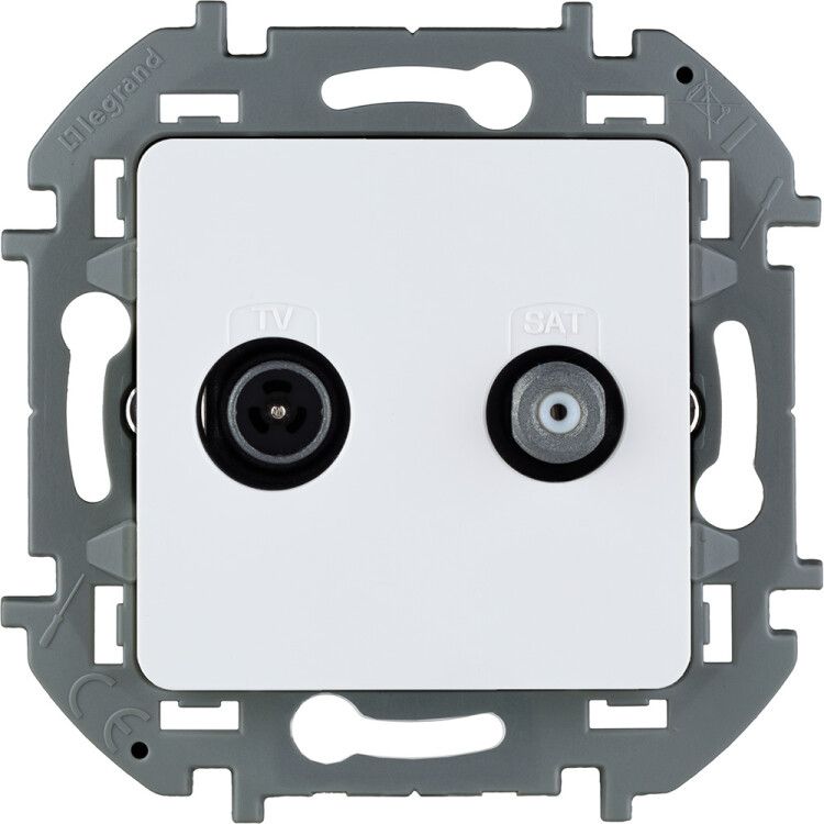Розетка телевизионная TV/SAT звезда белая без рамки Legrand Inspiria (артикул 673880) - оконечное устройство для скрытого монтажа в телевизионных сетях по схеме «звезда». Обеспечивает надёжное подключение двух телевизионных приёмников к одному коаксиальному кабелю, содержащему смешанный эфирный и спутниковый сигнал, с поддержкой обратного питания активных антенн.