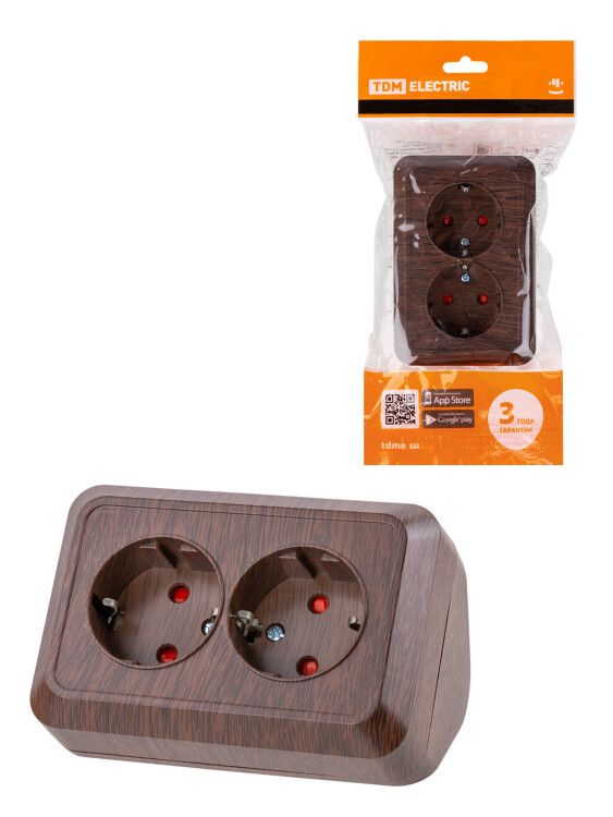 Розетка угловая двойная 2П+3 открытой установки с з/ш IP20 250В 16А бук "Ладога" | SQ1801-0343 TDM