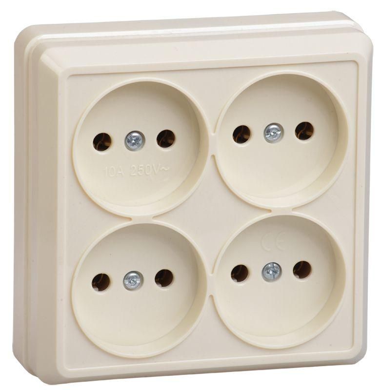 Розетка 4-местная без заземления 10А открытой установки кремовая серия Октава предназначена для подключения однополярных электроприборов мощностью до 2,5 кВт (при 250 В и 10 А). Подходит для временных или постоянных подключений в жилых, офисных и производственных помещениях, где нет необходимости в защитном заземлении - например, для светильников, зарядных устройств, маломощных инструментов и бытовой техники класса II.
