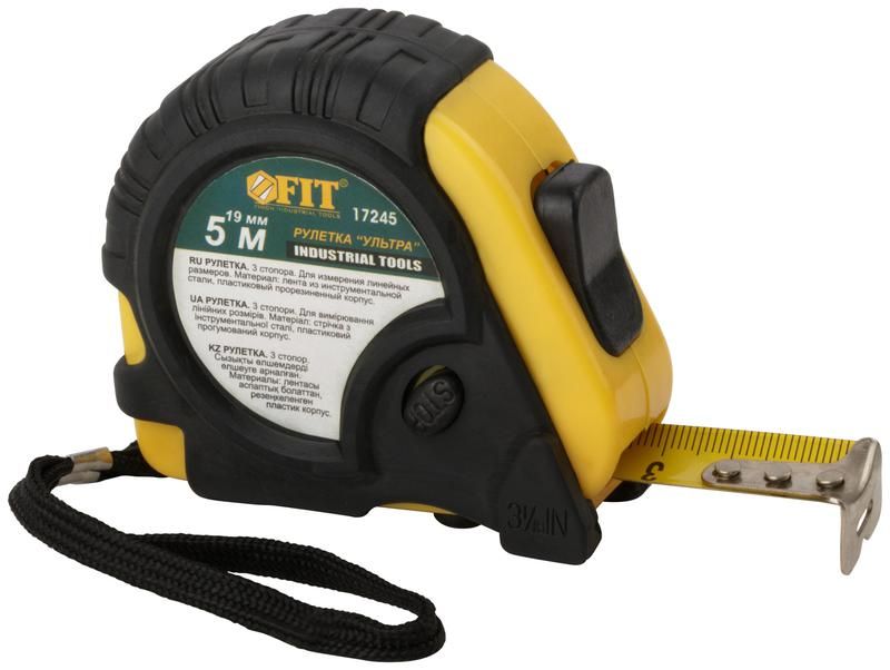 Рулетка 5мх19мм желто-черная прорезиненый корпус тройной стопор калиброванная лента - 17245 FIT - надежный и удобный инструмент для профессионального использования.