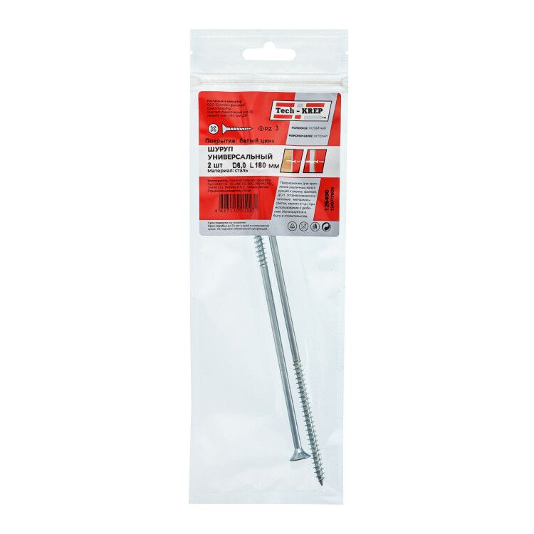 | Саморезы универсальные 180х6,0 мм (2 шт) оцинкованные - пакет ( 0,045 кг) | 126490 | Tech-KREP | 06.03.2026 | Под заказ | 48,46 ₽ | уп. | от 30 дней |
