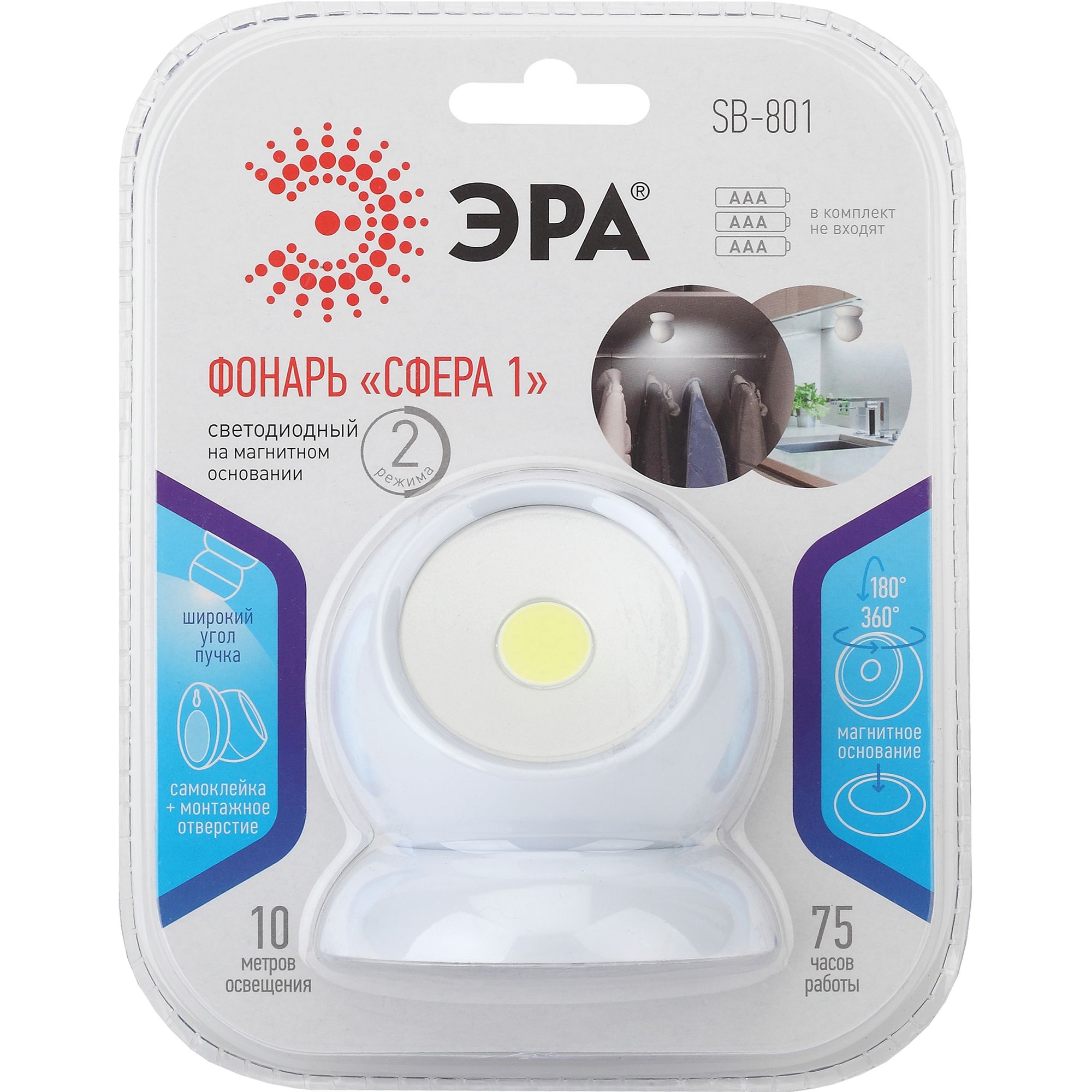 Фонарь подсветка ЭРА SB-801 Сфера-1 - компактный переносной светодиодный источник света с магнитным креплением и сменным блоком питания, предназначенный для точечного освещения в труднодоступных местах. Подходит для установки на металлические поверхности в кухнях, мастерских, шкафах и на оборудовании. Модель работает от трёх батареек AAA, обеспечивая до 72 часов автономной работы.