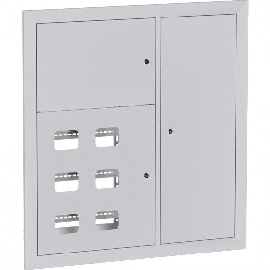 Щит этажный шестиквартирный (1000х950х160) Basic имеет встроенную несъемную металлическую раму - она служит основой для фиксации DIN-рейки и оборудования. Монтаж заподлицо требует подготовки ниши глубиной не менее 170 мм. Крепление к стене выполняется через отверстия в боковых гранях. Обратите внимание: щит не содержит внутренних элементов - шины, сжимы “Орех”, провода и устройства необходимо закупать отдельно. Все двери открываются на петлях, имеют замки для безопасности.