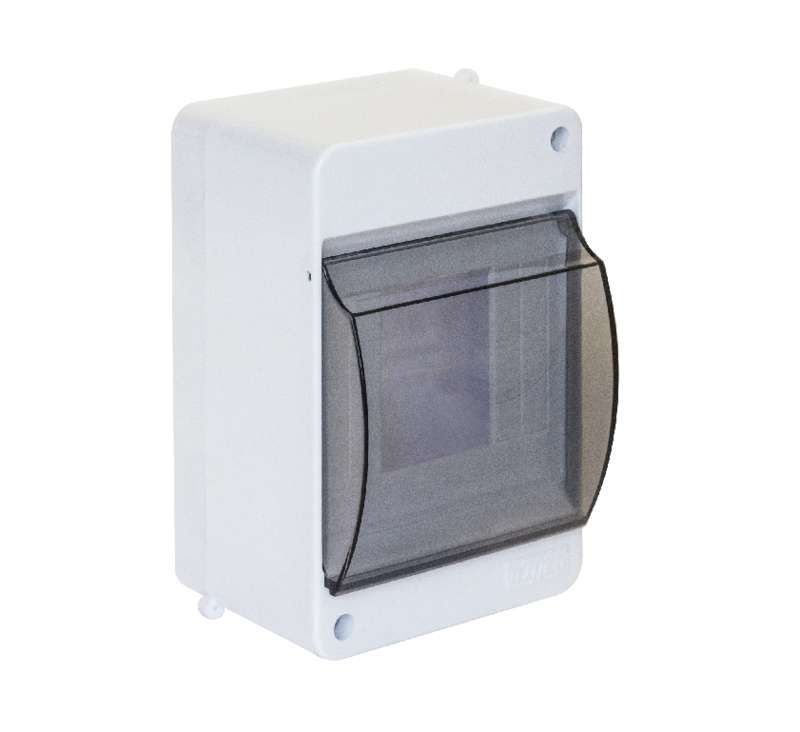 Щиток распределительный открытого исполнения на 4 модуля с вертикальной дверцей 130х87х83мм совместим со всеми стандартными модульными устройствами шириной 17,5 мм. Для монтажа используются два крепёжных отверстия на задней стенке - достаточно двух дюбелей или саморезов. Корпус рассчитан на фиксацию на гладкой поверхности: бетон, кирпич, деревянную обрешётку. Вертикальная дверца обеспечивает удобный доступ к контактам даже при ограниченном пространстве перед щитком. Напряжение работы - до 440 В переменного тока, согласно нормам для бытовых щитков.