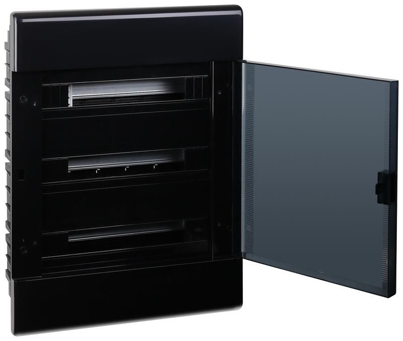 Щит распределительный встраиваемый на 54 модуля с дверцей черный IP41 предназначен для монтажа автоматических выключателей, УЗО, реле, счетчиков электроэнергии и других модульных элементов. Подходит для использования в жилых домах, офисах, складах, торговых центрах и производственных помещениях. Монтаж осуществляется в стену - корпус устанавливается в нишу, что позволяет сохранить эстетичный вид интерьера.