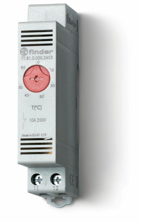 Термостат Finder 7T.81.0.000.2403 - компактный щитовой термостат с биметаллическим датчиком для автоматического включения обогревательных устройств при снижении температуры до заданного уровня. Подходит для установки в распределительных щитах на DIN-рейку и используется там, где требуется надёжное управление нагревом без сложной электроники.