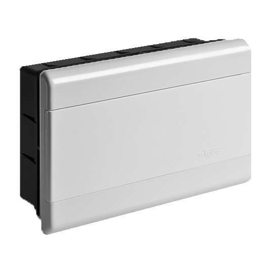 Щиток распределительный встраиваемый на 12 модулей с непрозрачной дверцей IP40 от Ruvinil (арт. 68112б) предназначен для компактного и безопасного монтажа автоматических выключателей, УЗО и других модульных устройств внутри стен в жилых, офисных и производственных помещениях.