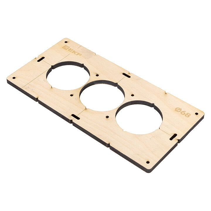 Шаблон для подрозетников с 3 отверстиями диаметром 68 мм от EKF (артикул sh-d68-3) - это инструмент для точной разметки мест под установку трёх подрозетников в бетоне, гипсокартоне и других материалах. Он исключает погрешности при сверлении и ускоряет монтаж электропроводки.