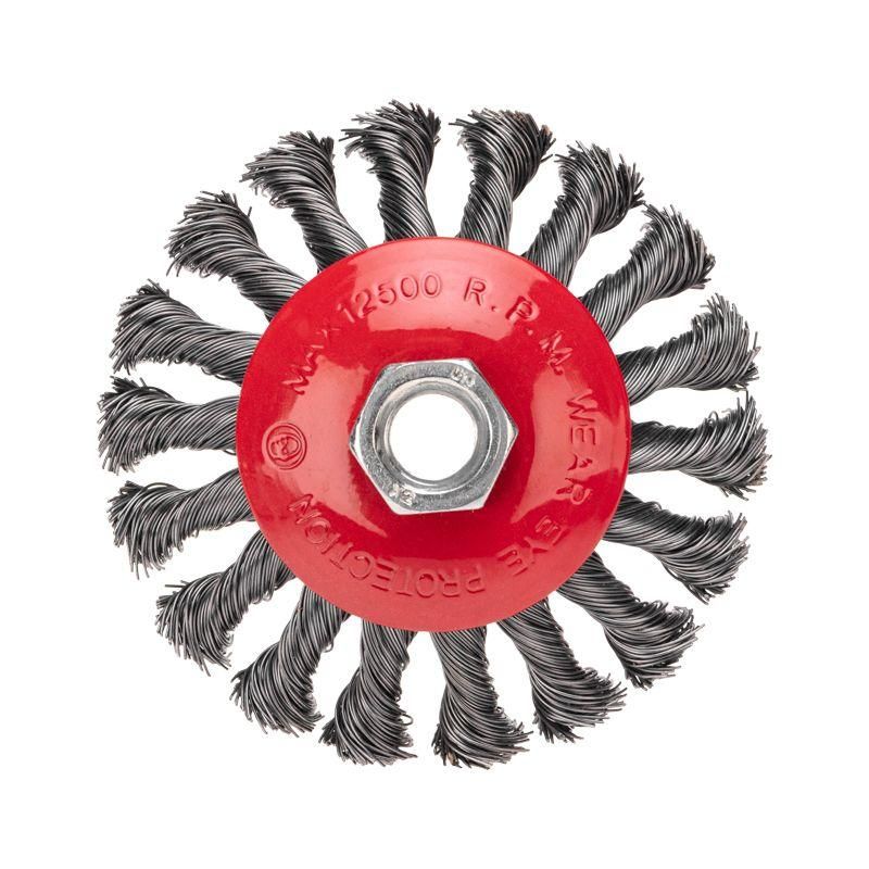 - Щетка коническая для угловой шлифовальной машины (УШМ) крученая стальная проволока 100 мм М14 - один из самых универсальных инструментов для предварительной подготовки стали; сочетание прочности и формы делает её незаменимой в условиях частого использования.