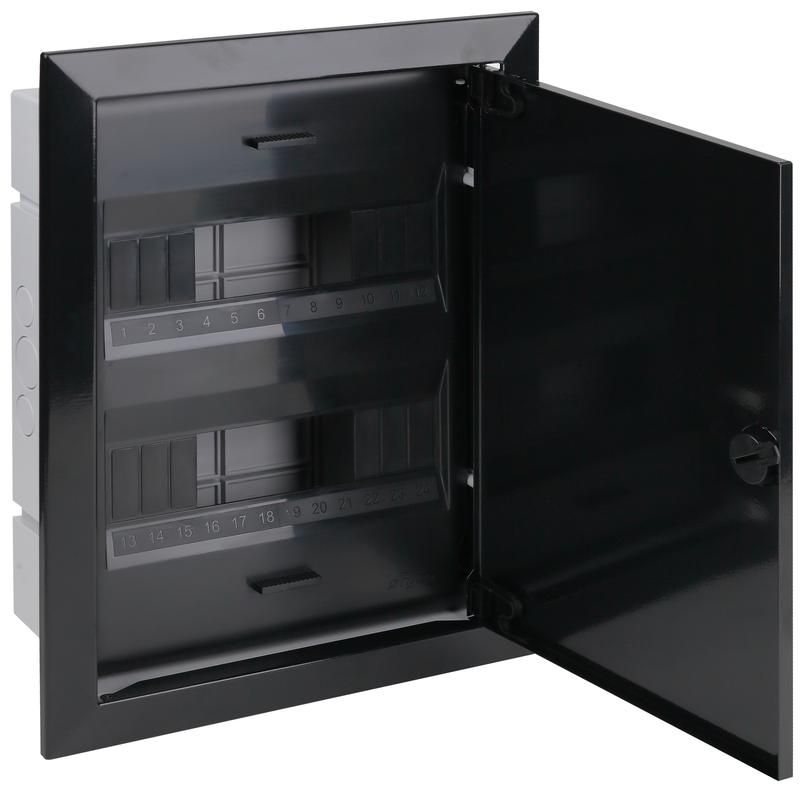 Щиток распределительный скрытой проводки с металлической дверцей на 24 модуля черный IP40 (ЩРВ-24, Ruvinil) предназначен для компактного монтажа автоматических выключателей, УЗО и других модульных устройств в стенах зданий. Этот щиток обеспечивает надежную фиксацию оборудования и защищает его от случайного доступа, сохраняя эстетичный внешний вид интерьера.