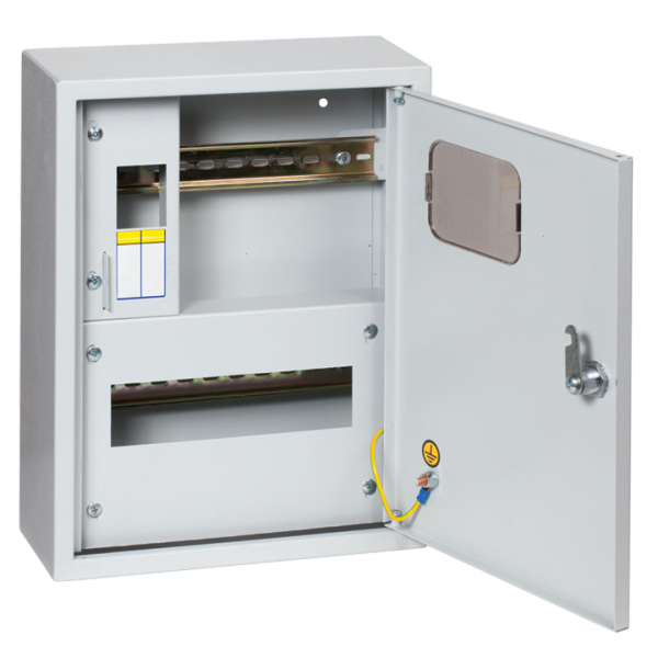 Щит учетно-распределительный навесной ЩУРн 1/12 совместим с любым модульным оборудованием, соответствующим стандарту DIN EN 60715. На внутреннюю стенку уже установлена металлическая DIN-рейка - достаточно закрепить автоматы, УЗО, счётчики и другие устройства. Монтаж выполняется накладным способом: корпус крепится к стене с помощью четырёх отверстий в задней части. Для доступа к проводкам используется откидная крышка с вырезом - она фиксируется на шарнире и не требует демонтажа при обслуживании. Дверца с замком обеспечивает безопасный доступ только авторизованным лицам.