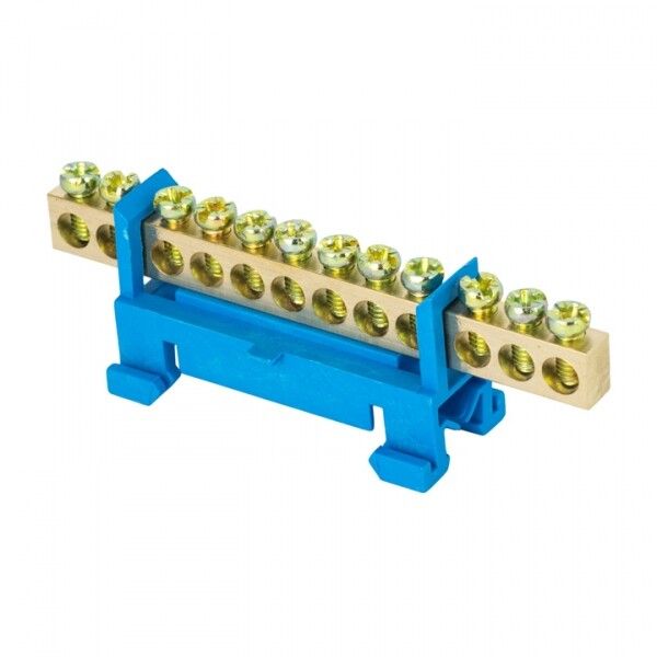Шина монтируется на стандартную DIN-рейку типа TS35. Крепится через синие изоляторы, которые исключают случайное замыкание на корпус щита. Для подключения используются винты с круглым основанием - они не пережимают и не режут жилу провода. Максимальное сечение провода - 10 мм2; меньшие сечения (1,5–4 мм2) требуют правильного затягивания винта без перегрузки. Установка возможна в любых щитах с достаточным свободным местом на рейке - рекомендуется оставлять минимум 10 мм между соседними шинами для доступа к винтам.