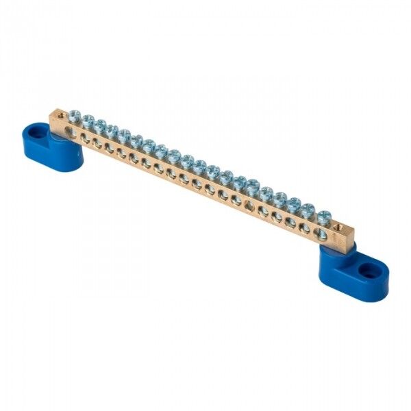 Шина нулевая N 6х9 мм 20 отверстий латунь 2 синих угловых изолятора от EKF серии PROxima - это надёжный элемент для распределения нулевого провода в щитах промышленного оборудования. Устройство обеспечивает безопасное и долговечное соединение многожильных и одножильных проводников сечением 1,5–10 мм2.