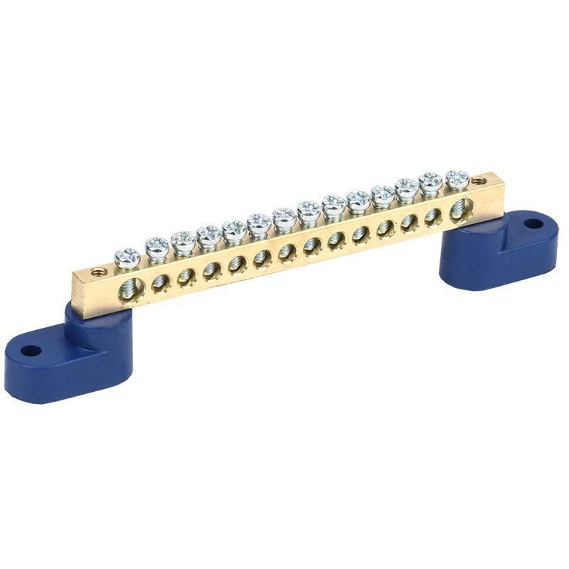 Шина нулевая 6х9 мм на двух угловых синих изоляторах 14 групп используется для создания единой точки подключения нулевых (N) и защитных (PE) проводников в распределительных щитах. Применяется в бытовых, коммерческих и промышленных электроустановках - например, в квартирных щитах, щитах управления станками, системах освещения и автоматизации. Подходит для подключения медных проводов с жилами до 16 мм2.