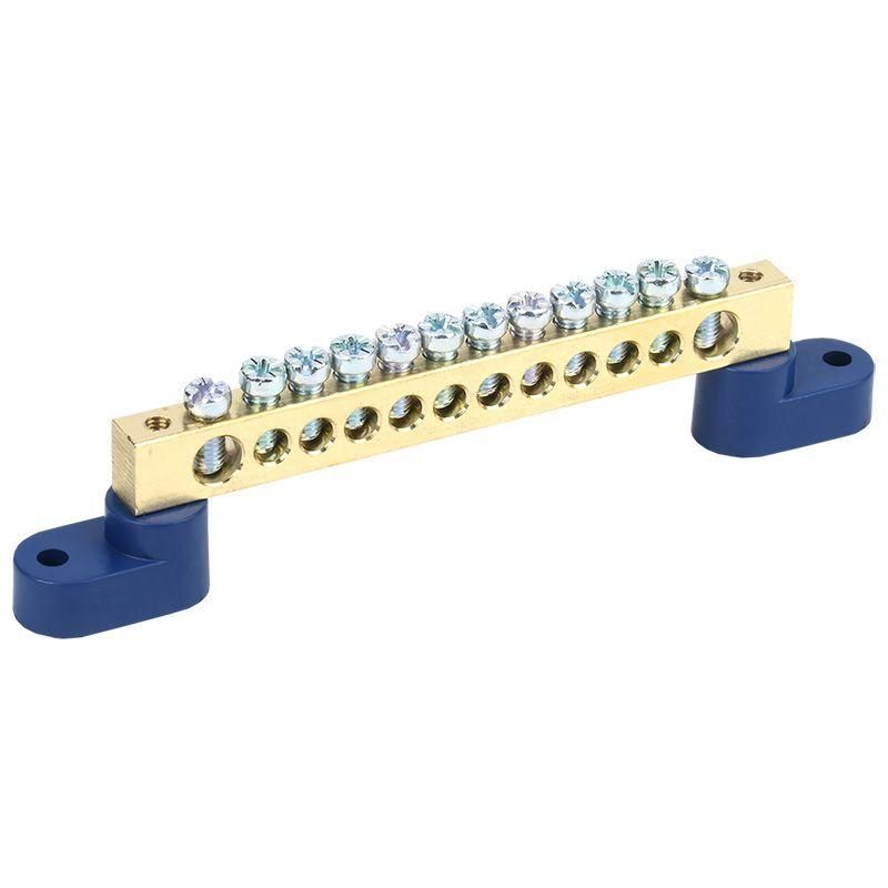 Шина нулевая 8х12 мм на двух угловых синих изоляторах 12 групп от REXANT - это компактное устройство для распределения нулевого и защитного провода в щитах. Артикулы etm11-2335 и 11-2335 подходят для сборки силовых и осветительных щитов с до 12 подключаемых цепей.