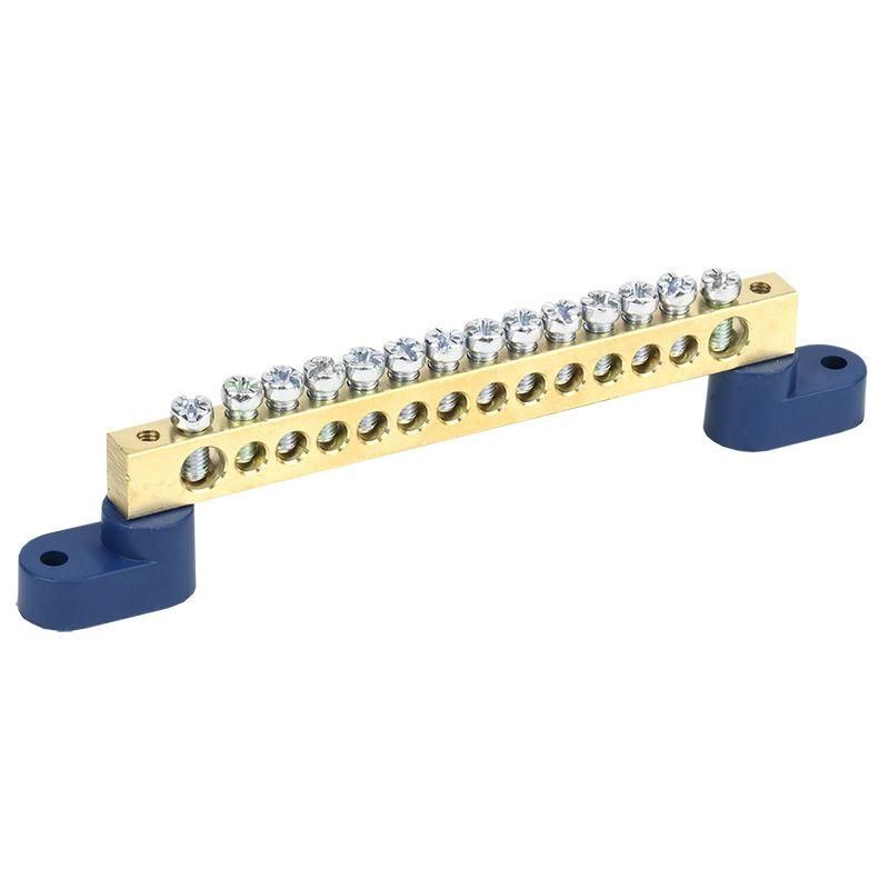 Шина нулевая 8х12 мм на двух угловых синих изоляторах 14 групп от REXANT (арт. 11-2336) - это компактное устройство для распределения нулевого и защитного провода в щитах. Подходит для монтажа на DIN-рейку, обеспечивает надёжное соединение до 14 проводников одновременно.