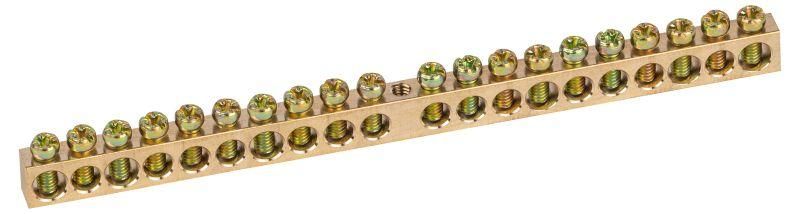 Шина PEN земля-ноль 6х9мм 20/1 латунная с креплениями по центру NO-122-19 используется для сборки нулевого (PEN) и защитного заземления (PE) в распределительных щитах. Подходит для жилых, коммерческих и промышленных объектов, где требуется объединение множества проводников - например, в этажных щитах, щитах автоматики, на производствах с большим количеством оборудования.