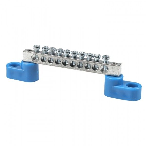 Шина нулевая N 6x9мм 10 отверстий цинк 2 синих угловых изолятора EKF, ГСИ - это надёжный клеммный блок для сборки нулевой шины в распределительных щитах. Продукт серии PROxima от EKF предназначен для безопасного и компактного подключения множества нулевых проводников с сечением до 9 мм2.