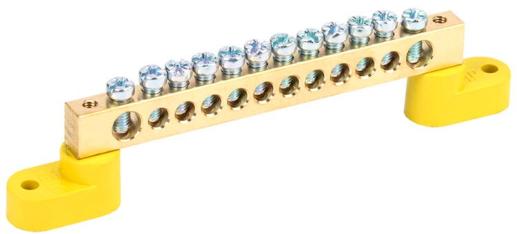 Шина выполнена в соответствии с требованиями к заземляющим устройствам в электроустановках. Желтый цвет исполнения соответствует ГОСТ 33542-2015 (цветовая маркировка PE-проводников). Латунная основа обеспечивает стабильное сопротивление контакта даже при циклических нагрузках. Наличие изоляторов исключает случайное замыкание на корпус щита. Условия эксплуатации (температура, влажность) соответствуют классу IP20 - не предназначен для открытых площадок или сырых сред.