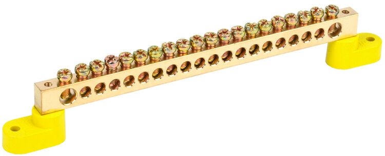 Шина выполнена в соответствии с требованиями к защищённому заземлению в распределительных устройствах. Латунная основа обеспечивает долговечность и безопасность при работе с токами до 125 А. Жёлтый цвет соответствует принятой цветовой маркировке для PE-проводников. Отсутствие покрытия не снижает безопасность - материал сам по себе устойчив к окислению в типичных условиях эксплуатации.