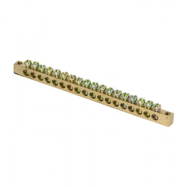 Шина PEN ноль-земля 6х9 мм 18 отверстий латунь крепеж по краям монтируется на DIN-рейку с помощью изоляторов (не входят в комплект). Для фиксации используются винты, расположенные по краям - они позволяют закрепить шину на пластиковом или металлическом основании. Диаметр отверстий рассчитан под стандартные винты M4–M5. Обязательно используйте изолирующие опоры - шина не имеет собственной изоляции. Подключение проводов выполняется винтовыми зажимами; рекомендуется использовать наконечники типа НШВИ для многожильных проводов.