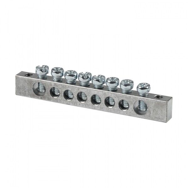 Шина PEN ноль-земля 6x9мм 8 отверстий цинк крепеж по краям от EKF (артикул sn1-63-08-k) - это компактный клеммный блок для объединения нулевых и заземляющих проводников в распределительных щитах. Она обеспечивает надёжное соединение до восьми проводов с помощью винтовых зажимов, расположенных по краям корпуса.