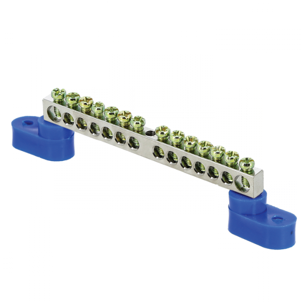 Шина нулевая N 6x9 мм 14 отверстий никель 2 синих угловых изолятора от EKF серии PROxima - это надежное решение для распределения нулевого провода в щитах, обеспечивающее безопасное и компактное соединение до 14 кабелей сечением 1,5–10 мм2.