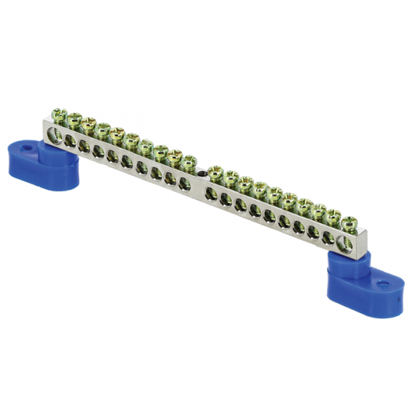 Шина крепится на DIN-рейку с помощью двух винтов, расположенных по бокам корпуса. Для монтажа требуется стандартный крестообразный отвертка. Диаметр отверстий рассчитан под винты M4 - совместима с большинством современных щитов. Синие угловые изоляторы обеспечивают безопасный зазор между шиной и металлическим корпусом щита, предотвращая случайное замыкание. Не требует специальных инструментов - подходит для монтажа даже в условиях ограниченного доступа.
