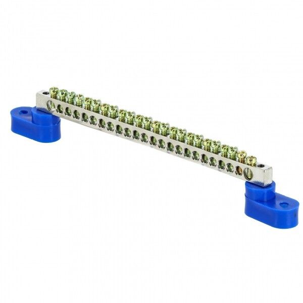 Шина совместима с DIN-рейкой 35 мм - крепится через винты, предусмотренные в основании. Для монтажа используйте стандартные винты M4 или M5 (не входят в комплект). Учитывайте посадочное место: шина имеет ширину 9 мм, поэтому требует свободного места между другими элементами щита. Синие угловые изоляторы позволяют устанавливать шину на металлический корпус без риска замыкания. Не рекомендуется использовать для заземления PE - эта шина предназначена только для нулевого проводника (N).