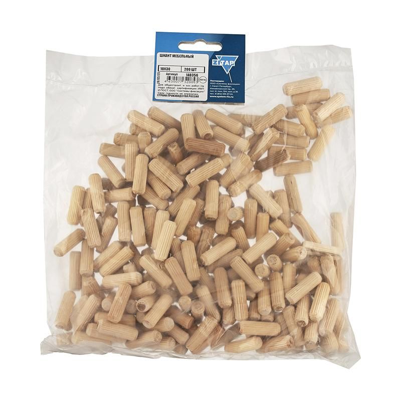 Шкант мебельный 10x30 мм (упаковка 200 штук) от бренда Zitar - цилиндрический деревянный элемент для точного соединения деталей мебели, например, между фасадами и корпусом. Упаковка содержит 200 штук артикула 148356, что удобно для серийного производства и ремонта.