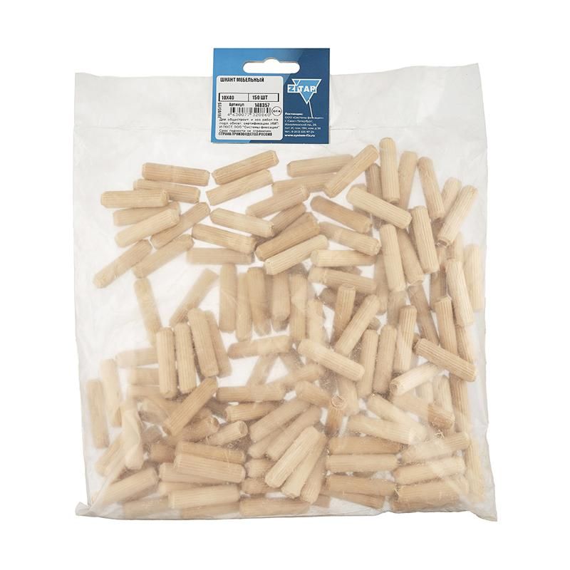 Шкант мебельный 10x40 мм (упаковка 150 штук) от бренда Zitar - цилиндрический соединительный элемент из древесины, используемый для точного и прочного соединения деталей мебели. Артикул 148357 подходит для сборки корпусной мебели, столешниц и других изделий, где важна невидимость крепления.