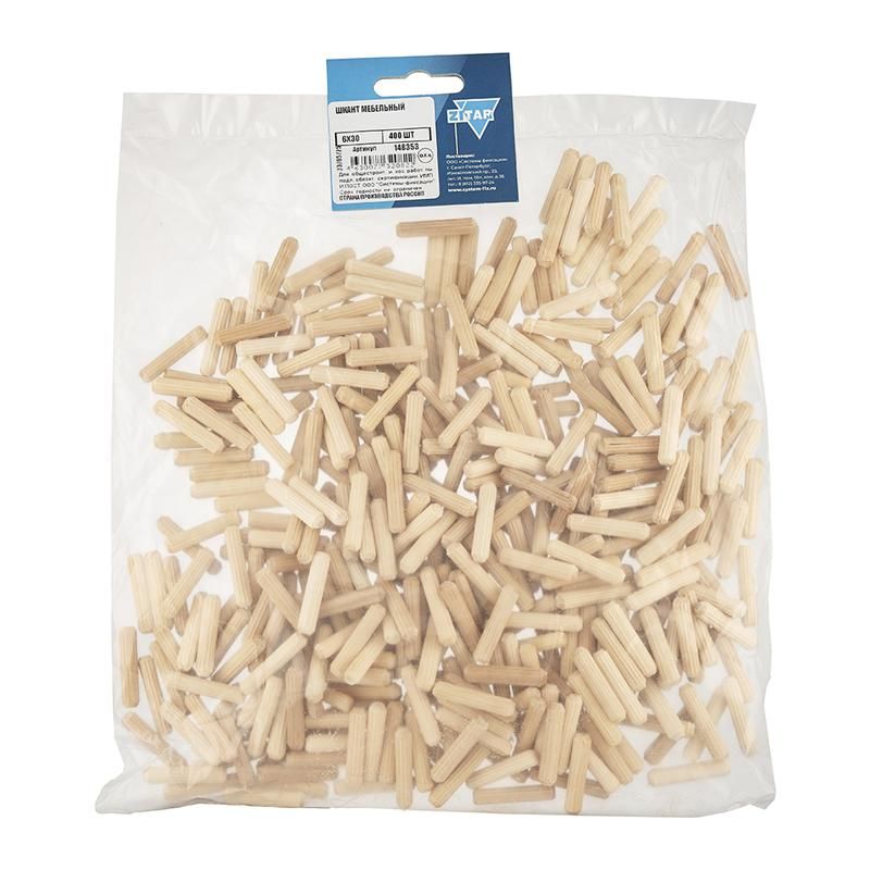 Шкант мебельный 6x30 мм (упаковка 400 штук) от бренда Zitar - цилиндрический деревянный соединительный элемент, используемый для точного и прочного сбора мебели из древесностружечной плиты (ДСП) и массива дерева. Артикул 148353 подходит для массового производства и ремонта корпусной мебели.