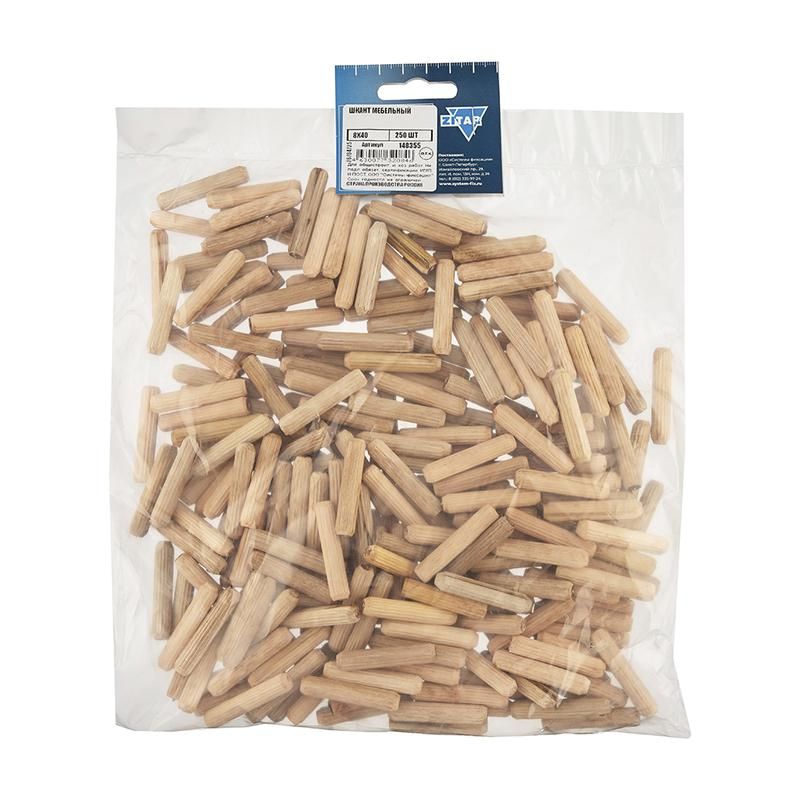 Шкант мебельный 8x40 мм (упаковка 250 штук) от бренда Zitar - цилиндрический деревянный соединительный элемент, используемый для точного и прочного сбора мебели из древесностружечной плиты (ДСП) и массива дерева. Артикул 148355 предназначен для массового производства и ремонта корпусной мебели.